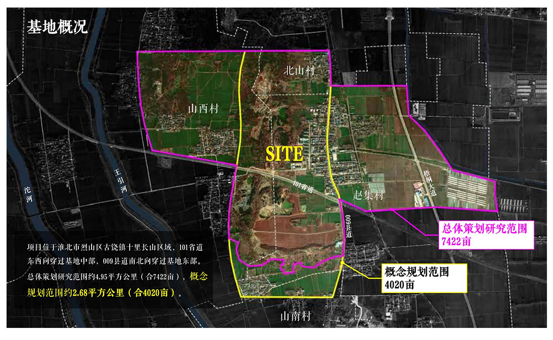 項(xiàng)目位于淮北市烈山區(qū)古饒鎮(zhèn)十里長(zhǎng)山區(qū)域,鹽洛高速公路淮北南出口東南5公里,303省道東西走向穿過(guò)項(xiàng)目中部??傮w策劃范圍約4.956平方公里(合7435.1畝),概念規(guī)劃范圍約2.68平方公里(合4020畝)。